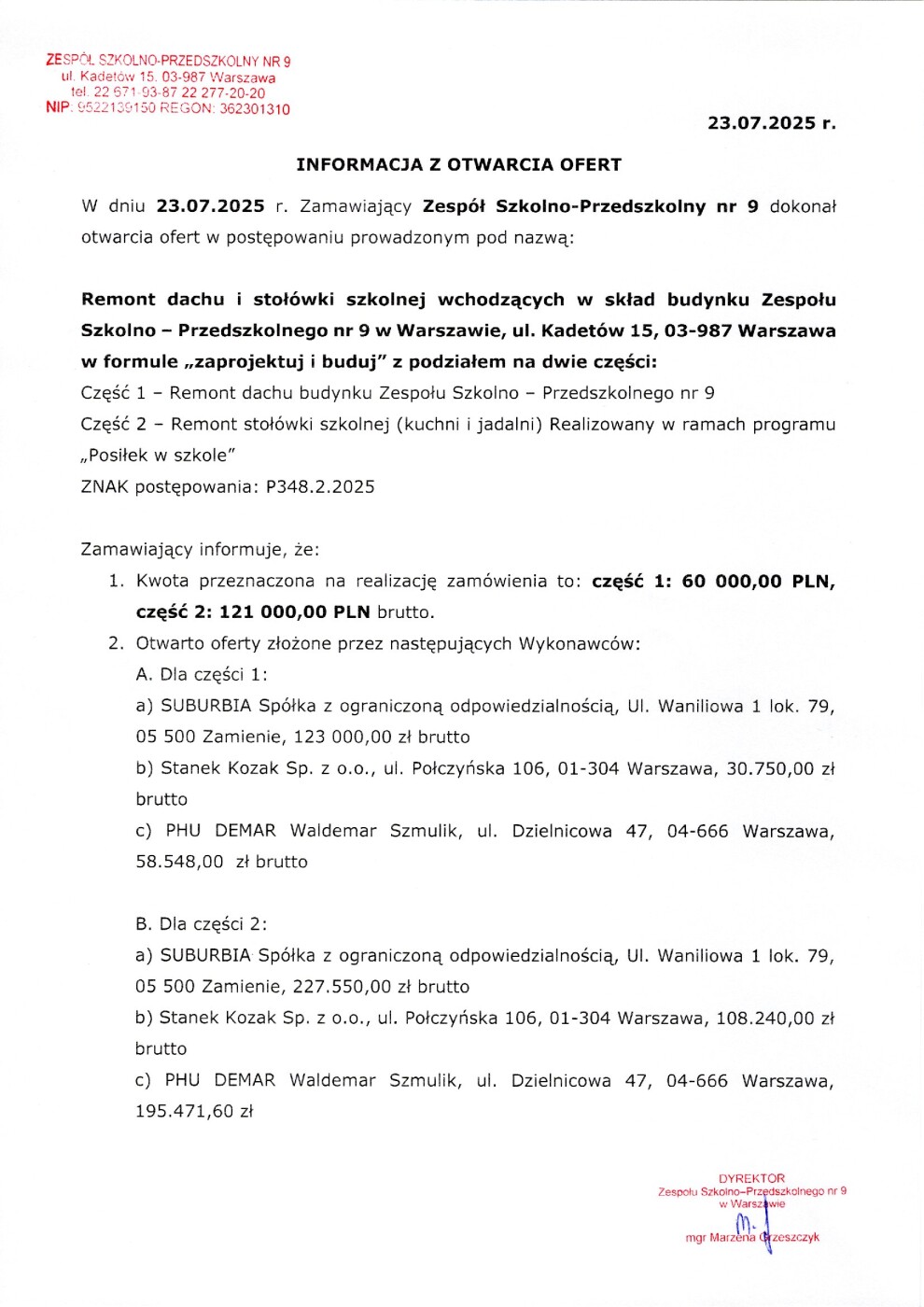 Informacja o wyniku postępowania i o odrzuceniu oferty przetargu w zakresie remontu stołówki szkolnej wchodzących w skład budynku Zespołu Szkolno – Przedszkolnego nr 9 w Warszawie, ul. Kadetów 15, 03-987 Warszawa w formule „zaprojektuj i buduj”